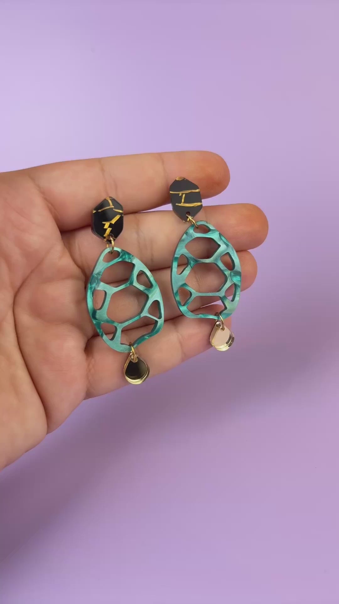 Udržitelné a stylové, náušnice Mořská hladina přeměňují zbytky akrylu na oslnivé doplňky v tyrkysových, černých a zlatých tónech. Ručně vyrobená krása s nulovým odpadem!