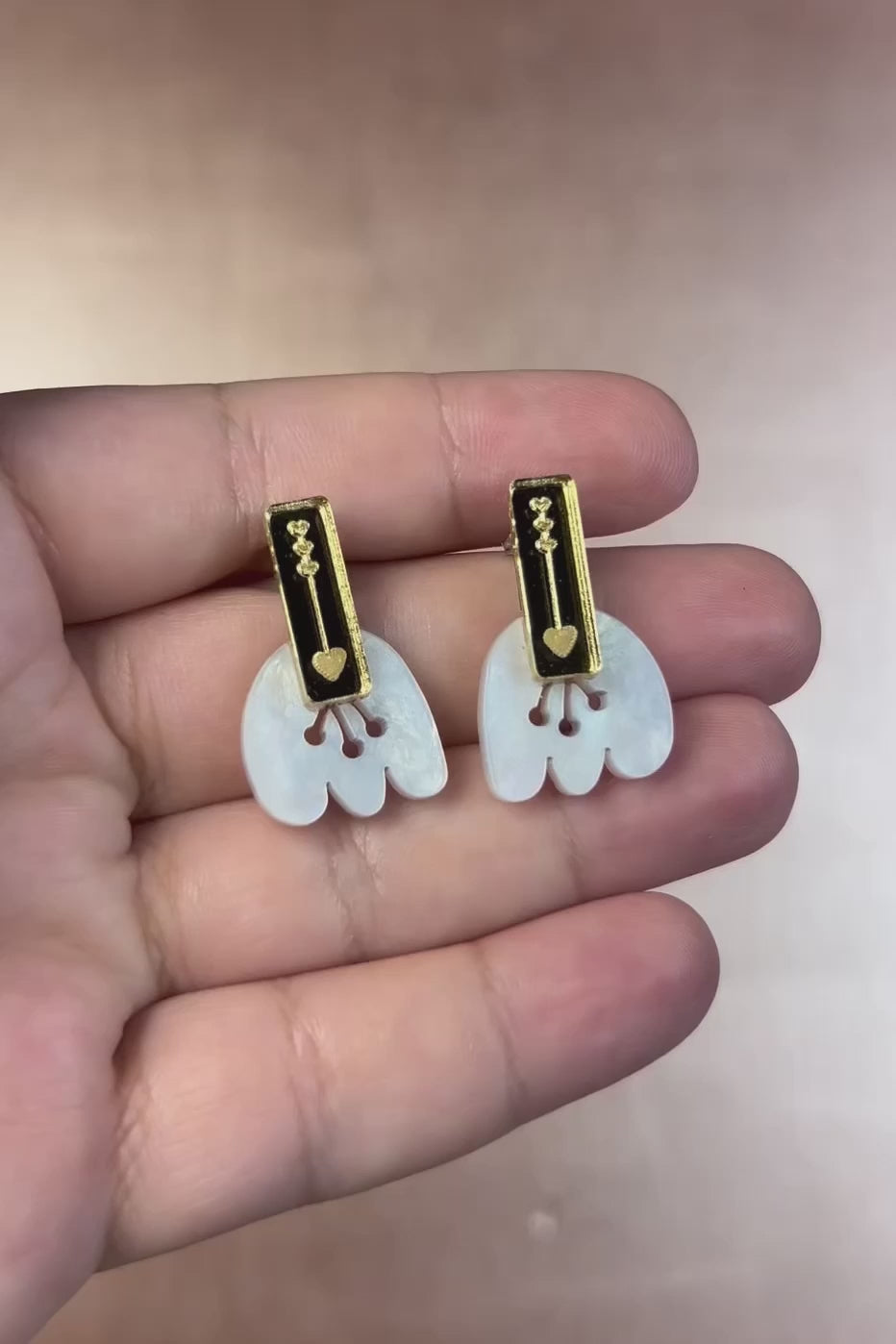 Každou náušnici krásně zdobí laserem vyřezávaný bílý tulipánový vzor z mramorovaného akrylového skla pro texturovaný a zářivý efekt. Třpytivý zlatý zrcadlový detail – s vygravírovanou jemnou šipkou ve tvaru srdce – dodává náušnici nádech romantiky a sofistikovanosti. Náušnice jsou pečlivě vyrobeny a mají hypoalergenní puzetky z nerezavějící oceli, které zajišťují pohodlí a odolnost při každodenním nošení. S rozměry pouhých 18 x 28 mm jsou lehké a snadno se nosí, díky čemuž jsou ideální na dlouhé dny nebo živé večery.