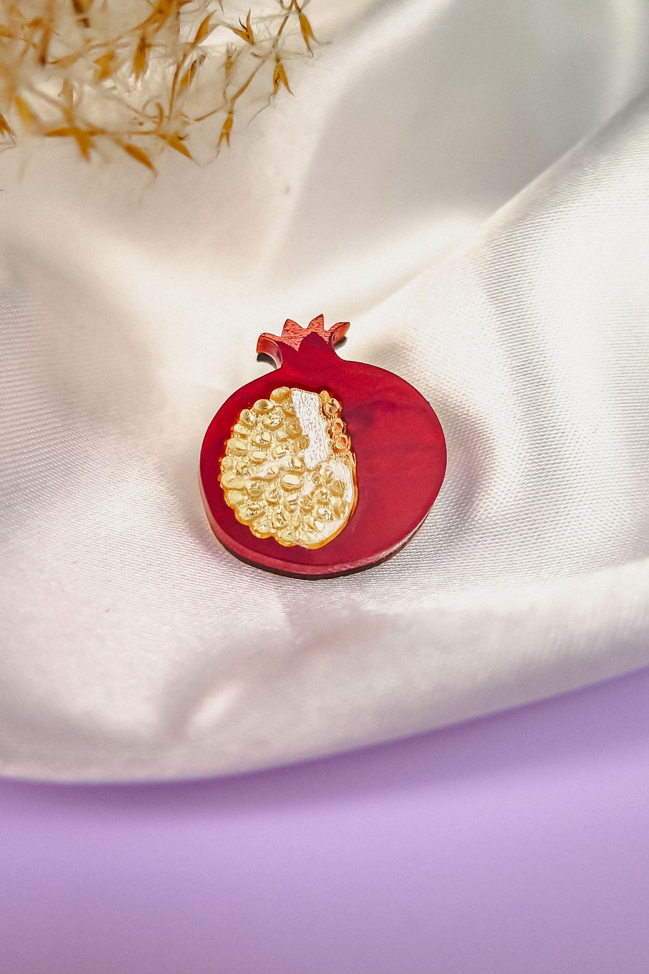 Hluboký, rubínově červený motiv granátového jablka je skvělým začátkem konverzace – s živými tóny, které evokují vášeň a energii. Jeho lesklý povrch a složité ručně malované detaily krásně odrážejí světlo, což ho činí ideálním pro kombinaci s ležérním i formálním oblečením. Ať už jste na nákupech, na akci nebo jen doplňujete svůj každodenní šatník, tato brož bude přitahovat komplimenty všude, kam půjde.