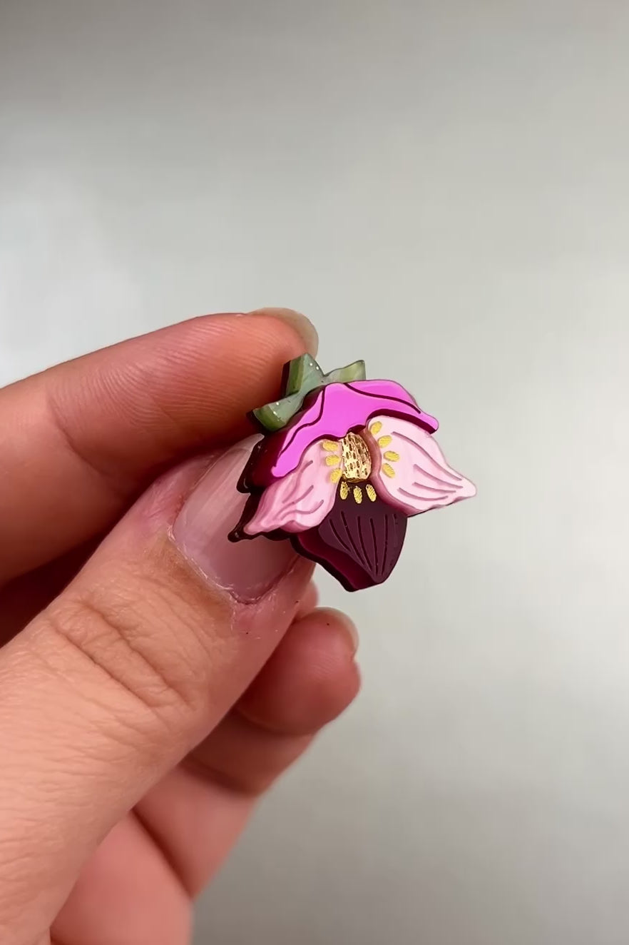 Dodejte svému stylu nádech přírody s pinem s fialovým květem čemeřice, vyrobeným ze zářivého akrylového skla a propracovaných detailů.