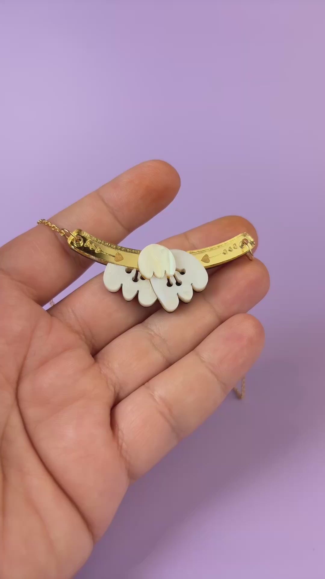 A handcrafted gold chain Tulip Necklace with a curved gold bar and heart engravings, featuring a white, petal-shaped pendant—radiating romantic charm against a light pink background.