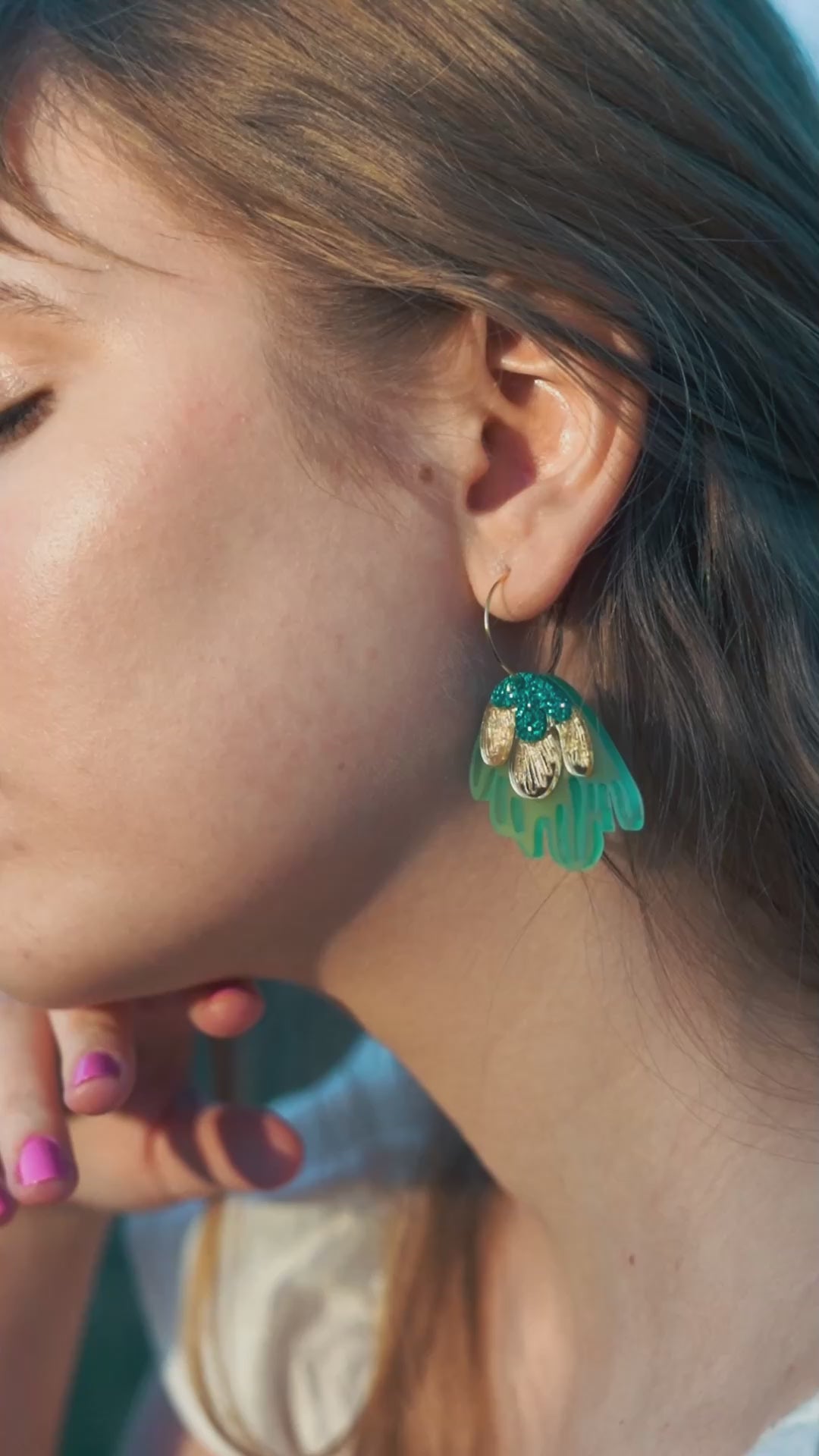 Vstupte do výrazné tropické elegance s našimi akrylovými organickými květy na zlatých kruzích. Lehké, ručně vyrobené a všestranné, vhodné pro každý outfit.