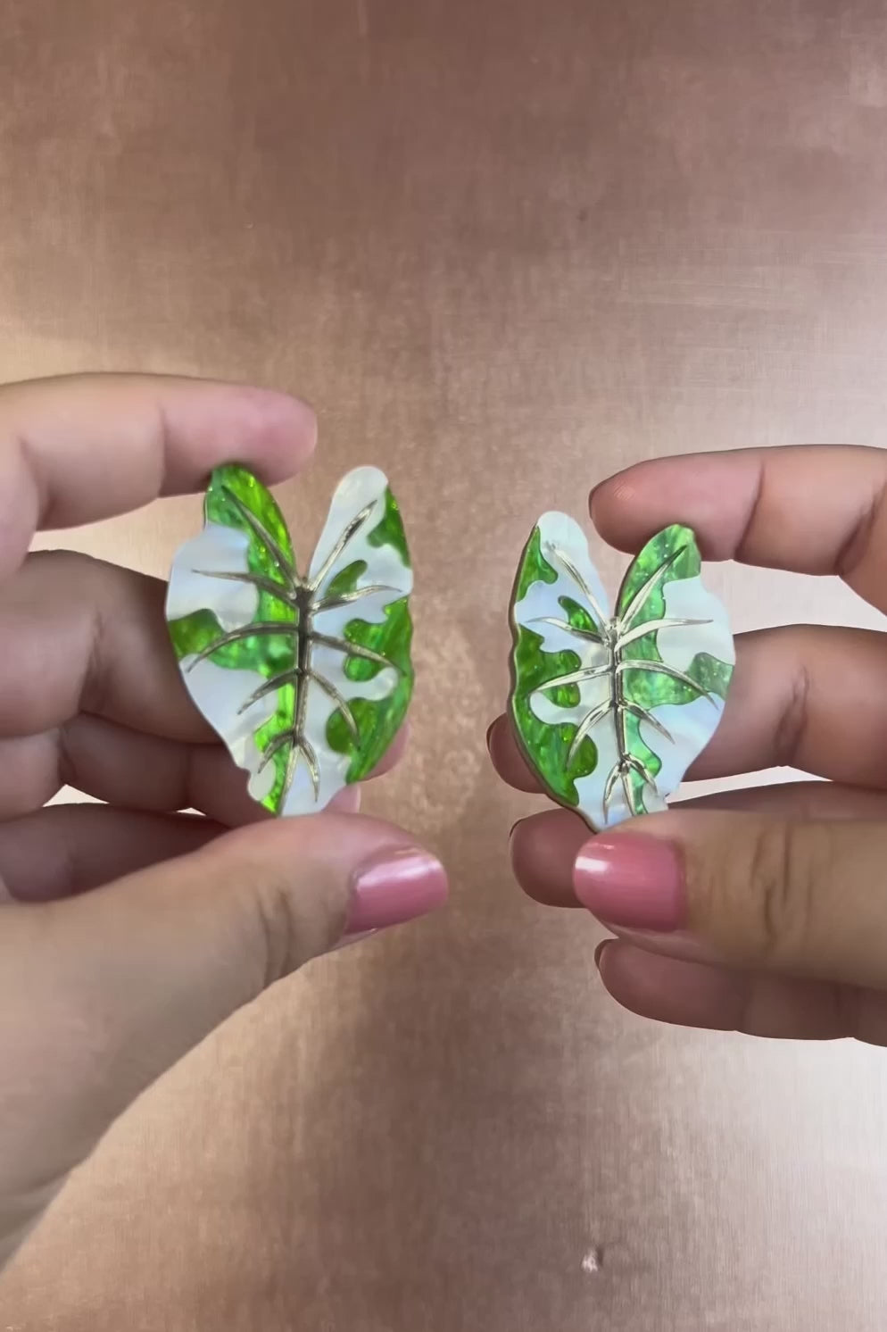Udělejte dojem s náušnicemi Alokázia - výraznými, ručně vyrobenými a lehkými šperky inspirovanými krásou listů Alocasia variegata.